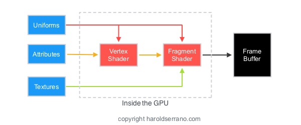 GPU에 들어온 모든 데이터는 다양한 경로로 처리된다. 예를 들면 attributes데이터는 Vertex shaders에 의해서만 받아지며, Uniforms 데이터느. Vertex shader와 Fragment shader에 의해서 받아질 수 있으며, Textures 데이터는 보통 Fragment Shader로 받아들여진다.