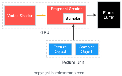 사실 Texture는 그냥 이미지 데이터이다. OpenGL에서는 이 이미지를 GPU로 보내는데 이때 사용되는 것이 Texture Objects이다. Texture object는 Texture Unit에 위치한다. 그리고 fragment shader는 이 texture unit을 Sampler를 통해서 참조한다. 개념도는 아래와 같다.