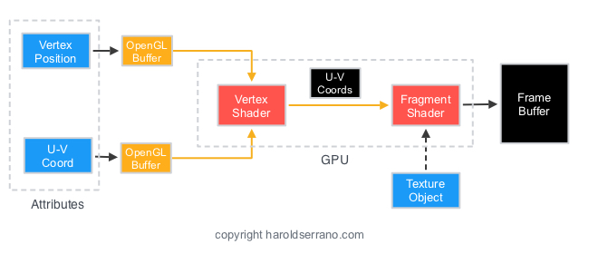 어떤 물체에 Texture를 입히기 위해서는 U-V coordinates와 Sampler를 Fragment shader에 보내줘야한다. 하지만 U-V 데이터는 Attribute이므로, Vertex shader를 먼저 지나게 된다. 그다음 fragment shader로 들어온다. 요약하면 아래와 같다.