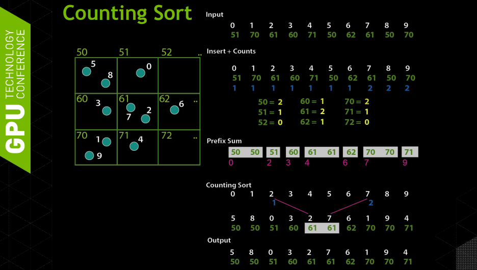 결국에는 그리드 안의 입자개수도 세야하기 때문에 Counting sort가 더 좋다, 프레임당 커널 콜이 적어 장점이 있다는 식으로 말하는 듯 합니다. 해보기전엔 잘 모르겠습니다. ㅎㅎ 여하튼 그리드당 존재하는 입자수를 세는데도 강점이 있으니 분명 특정 조건(그리드와 입자가 존재하는 영역이 비슷한경우?)에서는 좋겠습니다.