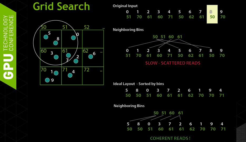 기존에 사용되던 그리드 기반 근접이웃탐색 알고리즘은 아래와 같습니다. 각 입자들에게 그리드의 인덱스를 부여받도록 하고, 그리드 인덱스 기준으로 정렬을 한 뒤, 그리드 인덱스별로 순회를 하는 것입니다.