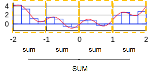 어떤 식 혹은 데이터를 적분하는데, 일반적인 식을 유도하는 방법이 어려울때 적분을 사칙연산으로 하겠다는 것이다. 여기선 자세히 설명하지 않으니보다 자세한 사항을 알고싶다면 위키피디아 및 다른 설명을 참고하시라. 여하튼 학창시절 배운 구분구적법과 방법론이 거의 동일하다. 대신 거기서 범위를 무한하게 쪼개는 것이 아니라, 유한하게 나누어 더하는, 일종의 근사식이다. 아래 식에서 lim 가 빠져있을뿐이다.