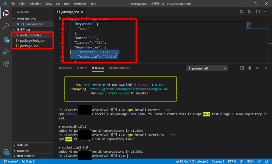 2. 폴더내 package.json 내용을 살펴보면, 아까 초기화때 적어넣은 내용과 socket.io가 설치된 것을 알 수 있습니다.