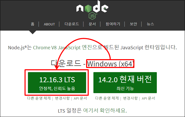 Node.js 사이트[링크]에서 자신의 운영체제(OS)를 확인한 후, 안정화된 버전(LTS)을 받도록 합니다.