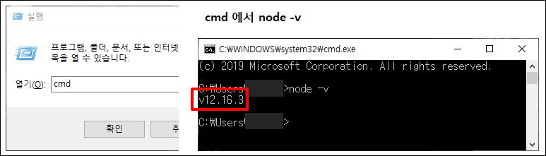 [WindowKey + R] 을 눌러 cmd 창을 열고, node -v 명령어를 통해 설치 버젼을 확인합니다.