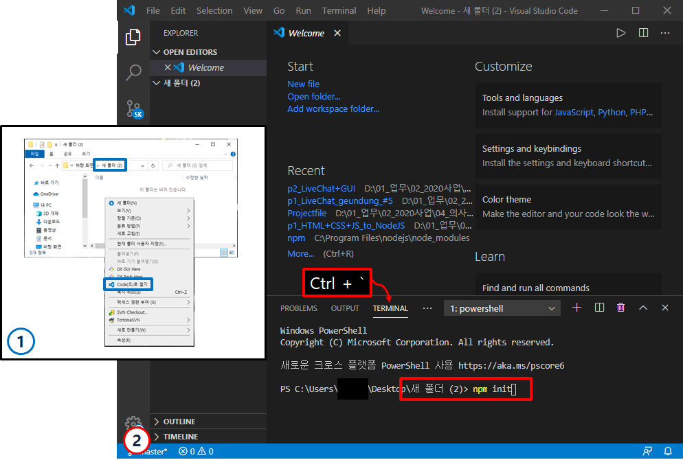 2. 열린 VSCode에서 [Ctrl + `]를 클릭하여 Terminal을 열고, [npm init] 명령어를 통해 폴더를 초기화* 시켜줍니다.