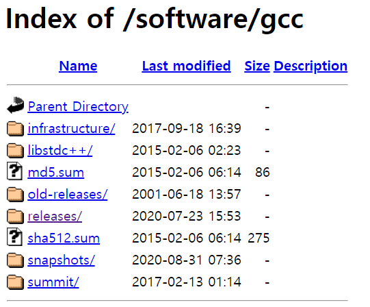먼저 GCC 홈페이지 링크(https://gcc.gnu.org/mirrors.html)에 접속하면, 미러 사이트들의 목록이 나오는데, 아무 사이트에서 최신버전 혹은 자신이 원하는 버전의 link를 복사해 온다. 예시로는 일본 사이트에서 받아왔다.