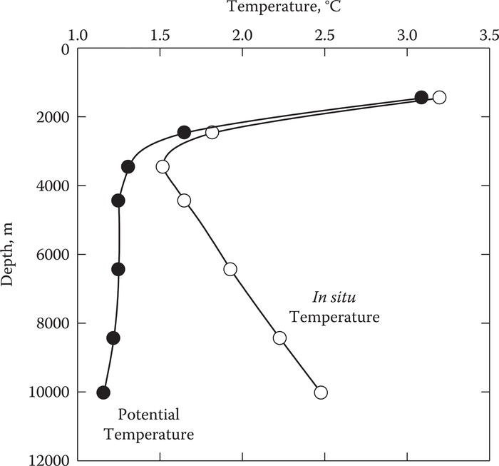 바다는 수표면쪽이 뜨겁고 깊은 곳은 거의 일정한 온도를 갖는다. 깊은 곳의 온도와 수표면의 온도를 비교하기 위해서는 생각해 보아야 할 것이 있는데, 바로 압력의 영향이다. 왜냐하면 수심 깊은 곳은 압력이 높아 1기압인 수표면과 온도를 비교하기에는 측정되는 환경이 다르기 때문이다. 그래서 현장온도(in situ temp)와 온위(potential temp)로 나눠 이해할 수 있다.