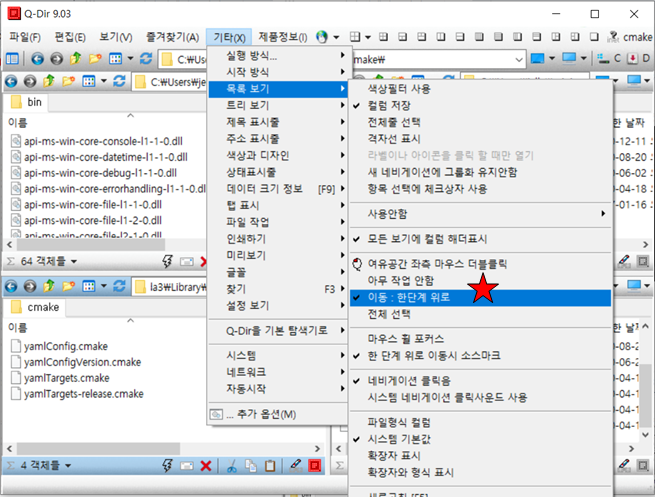한단계 위로 이동은 뒤로와는 다르다. 폴더 구조에서 한 수준 위로 이동하는 것이다. 필자는 뒤로보다는 한단계 위로 기능을 많이 사용하므로 이것을 여유공간 더블클릭 기능으로 사용하였다. Q-dir의 폴더 내 빈공간을 더블클릭하면 작동한다.